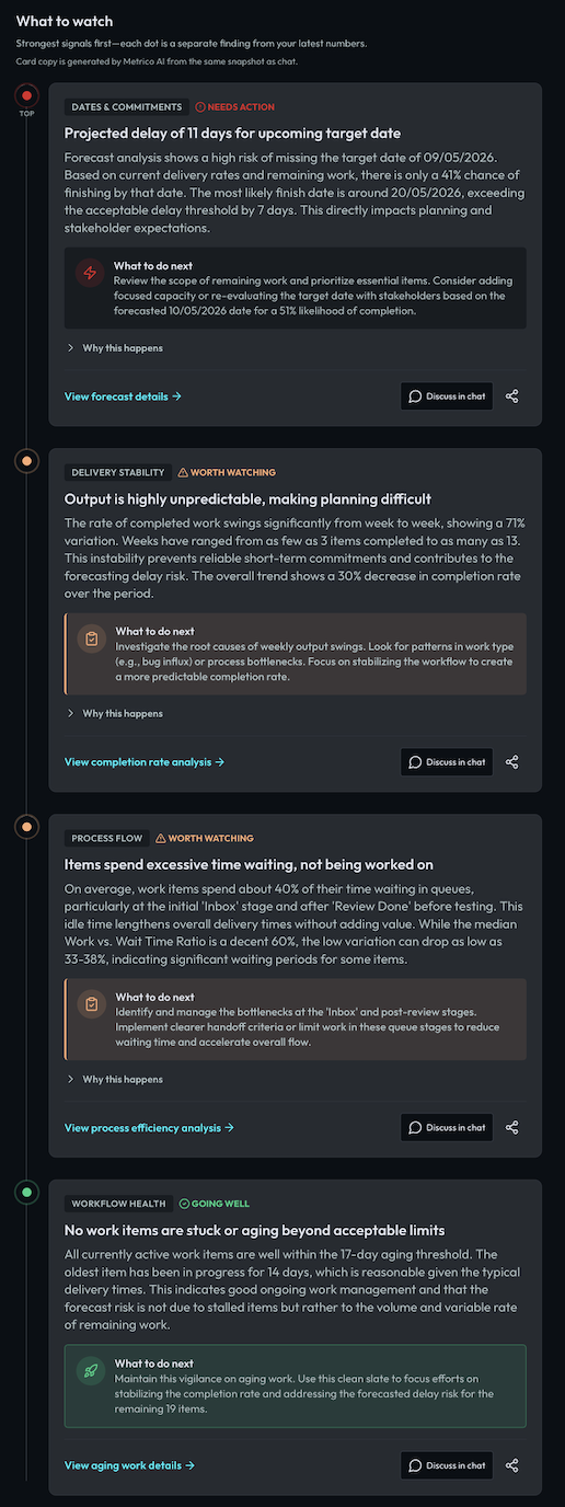 But when I started managing several teams at once, I became the bottleneck. I had clarity; every other manager was flying blind. The charts I trusted were a wall to anyone without a stats background — so the room went back to guesses. I built Metrico to fix that: same rigorous flow metrics underneath, plain-English answers on top. Clarity stops being one person’s job.